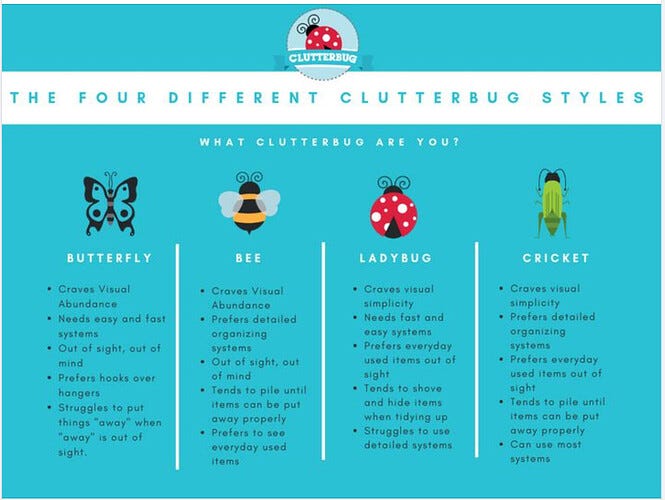If you aren’t familiar with Cassandra Aarssen’s Clutterbugs philosophy, check out the link (to take a quiz), or decide what describes you in the photo below.