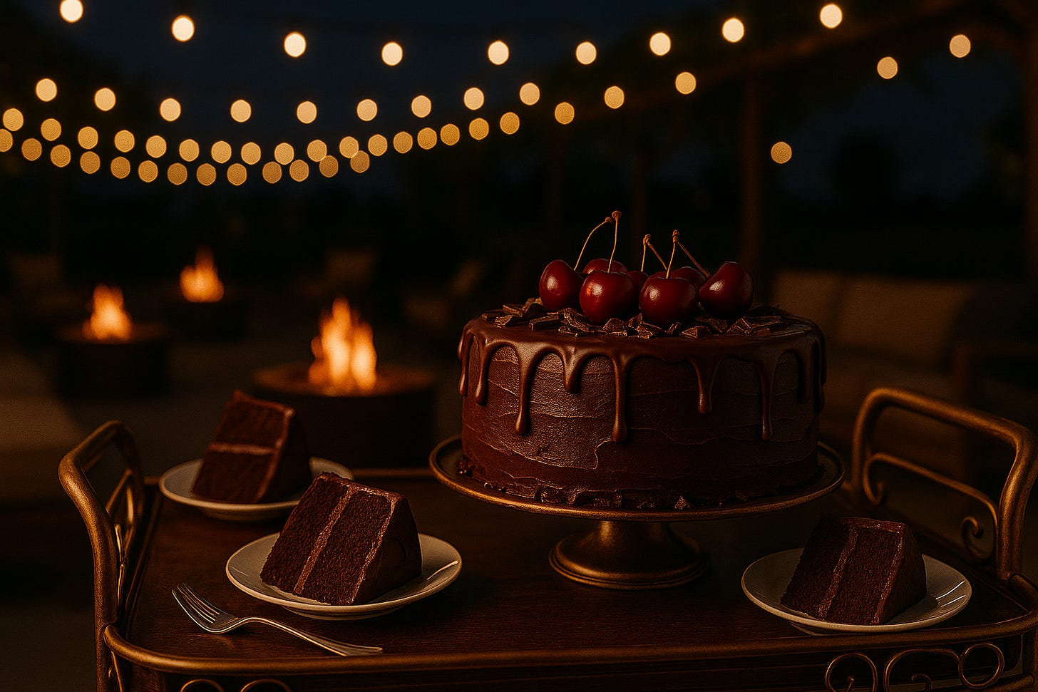 Somehow, without anyone noticing, a bar cart topped with slices of decadent-looking chocolate cake had arrived just outside our fire circle. I threw a glance at a few of the other fire pits, and they all had cake carts next to them as well.