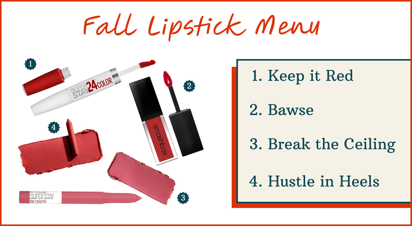 I’m known amongst coworkers and friends for my bold lip choices. Keep It Red is a must for every season. But fall work busy-ness demands additional bold colors like Break the Ceiling and Hustle in Heels. Or, if I’m channeling Devil Wears Prada vibes, it’s time to whip out Smashbox’s Bawse.