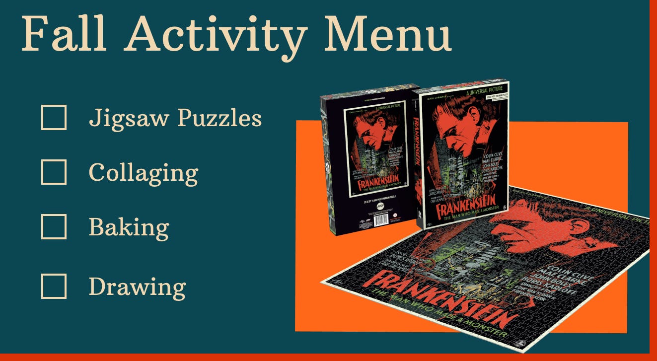 This menu is great for times when you aren’t sure how you want to spend your time. I use it as a fallback when I am feeling indecisive and want to keep the kids occupied. My youngest (4 yrs old) has been doing amazing at kids puzzles, so I decided we could work on a few 1000 piece puzzles together. We started with Mondo’s Classic Frankenstein poster3. We also love making collages, drawing, and baking; all great activities that don’t involve any screen time (unless we want them to!)