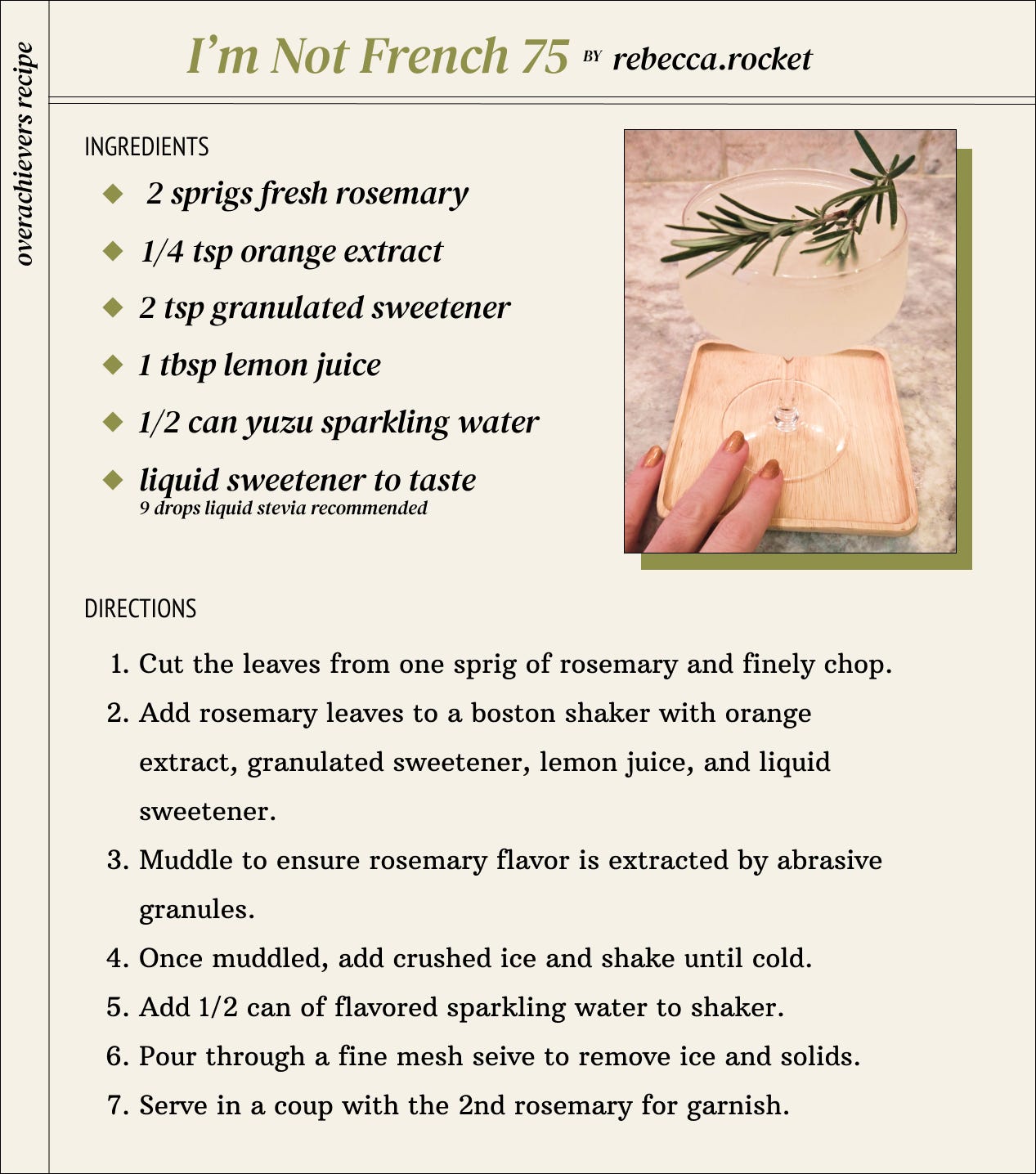 So, I present to you mocktail exploration #1: “I’m Not French 75.” A mocktail take on the French 75. Mine was zero-sugar, but you can use granulated sugar and simple syrup to the same effect.